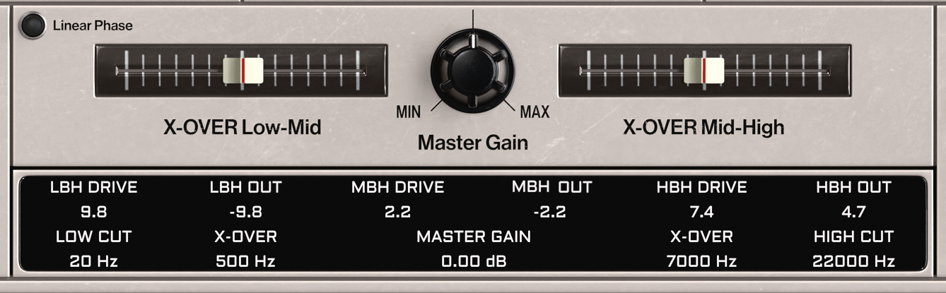 The Parameter Bar displays the set values of the three harmonics bands LBH (Low Band Harmonics), MBH (Mid Band Harmonics), HBH (High Band Harmonics), the Low- and High-Cut filters, the chosen frequencies of the two X-overs and the Master Gain.